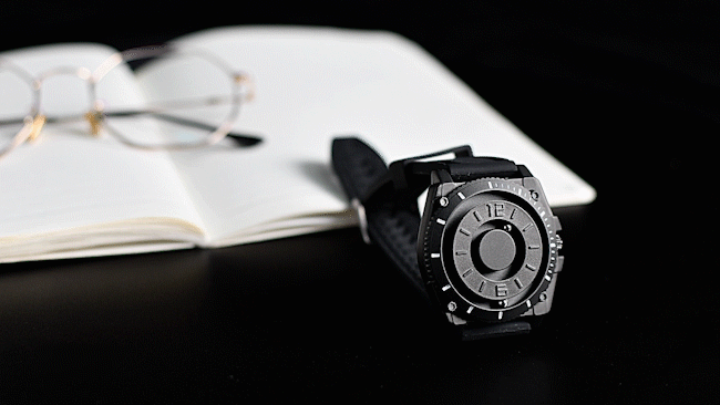 磁気によって動く2つの小さなボールを配置し、 一つのボールが「時」、 もう一つのボールが「分」を示し時刻を知らせます。